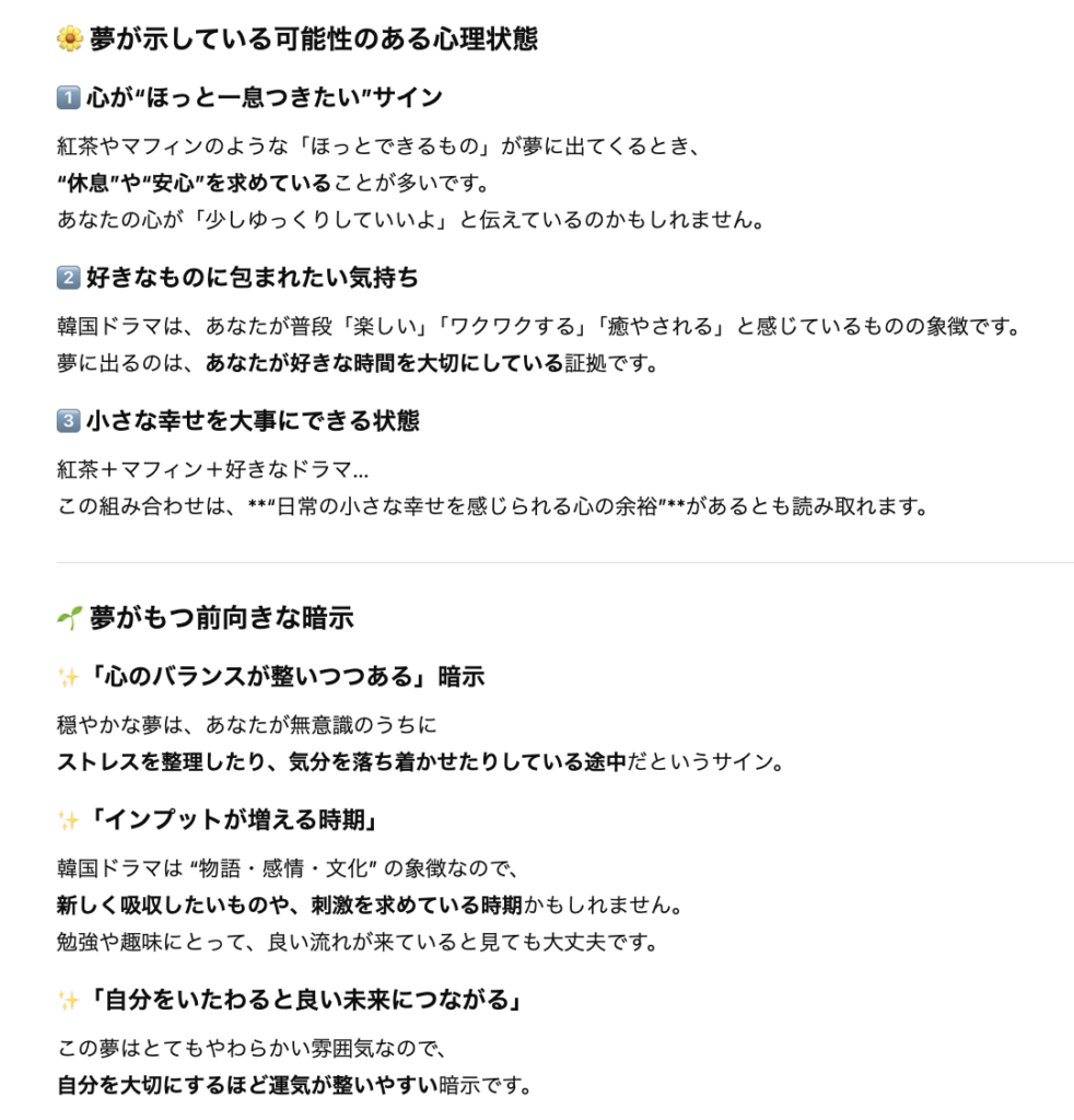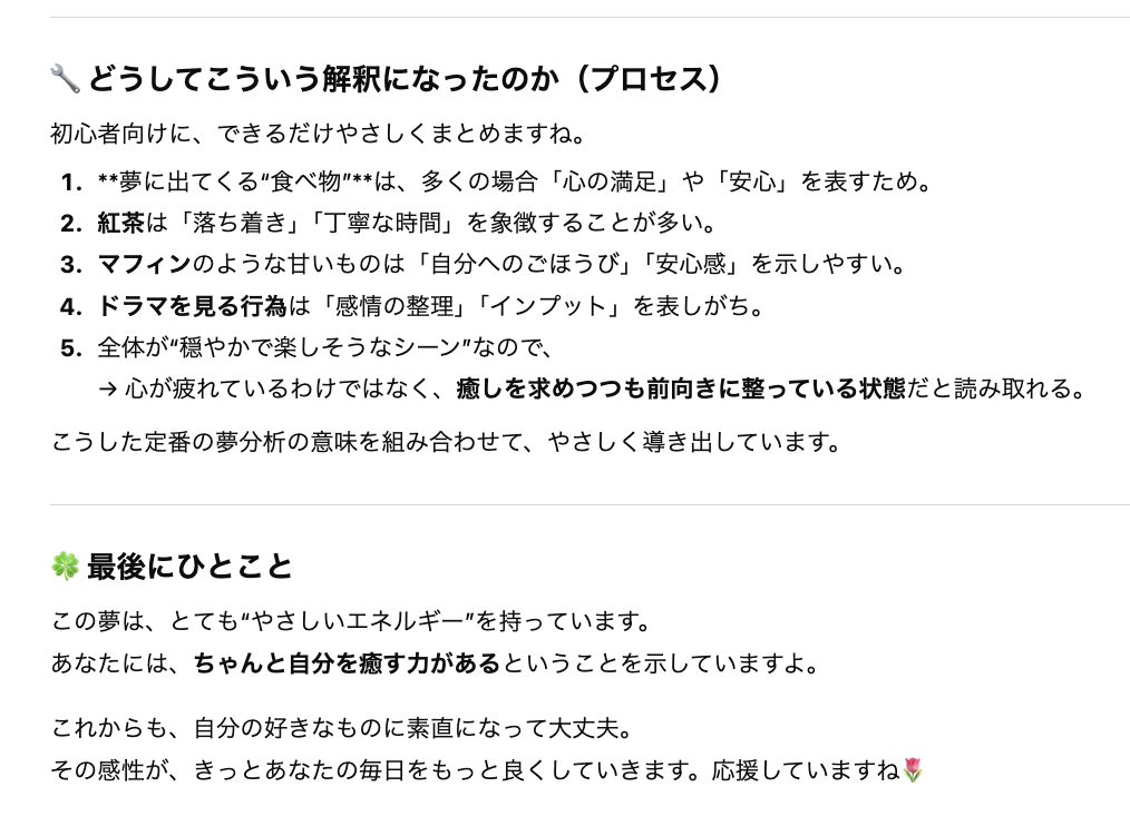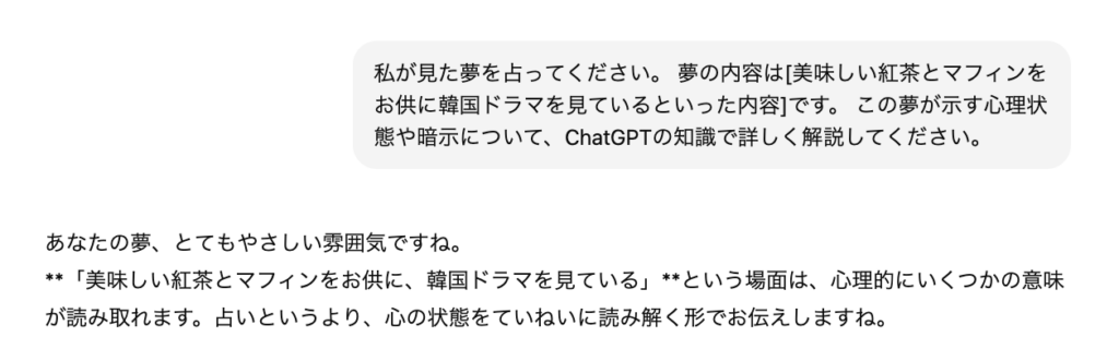 プロンプト:「私が見た夢を占ってください。夢の内容は[ここに夢の詳細を入力]です。この夢が示す心理状態や暗示について、ChatGPTの知識で詳しく解説してください。」