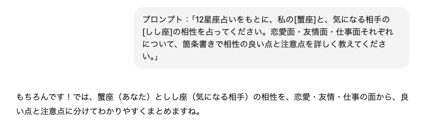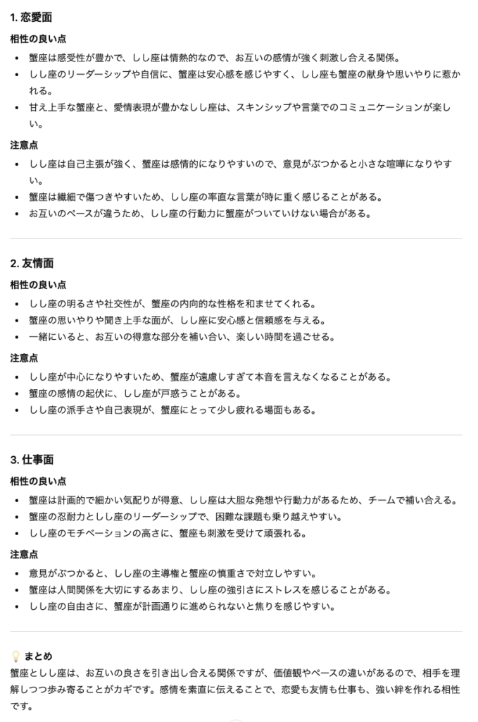 プロンプト:「12星座占いをもとに、私の[星座名]と、気になる相手の[相手の星座名]の相性を占ってください。恋愛面・友情面・仕事面それぞれについて、箇条書きで相性の良い点と注意点を詳しく教えてください。」
