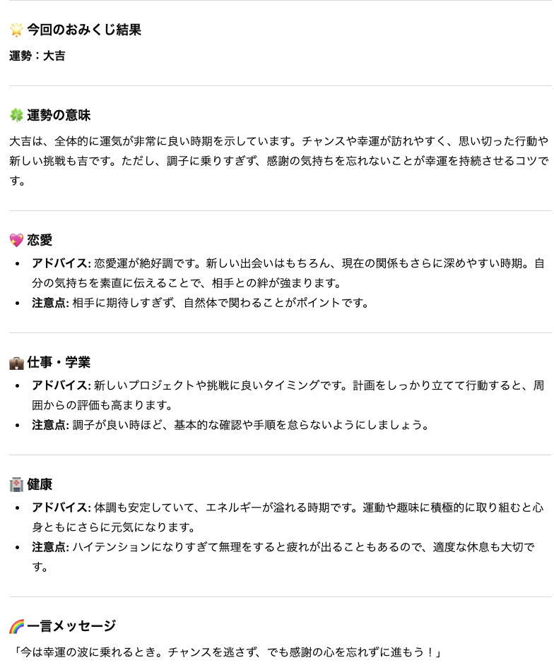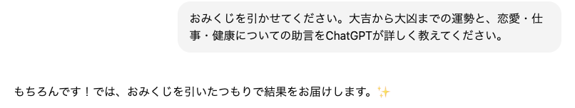 プロンプト:「おみくじを引かせてください。大吉から大凶までの運勢と、恋愛・仕事・健康についての助言をChatGPTが詳しく教えてください。」