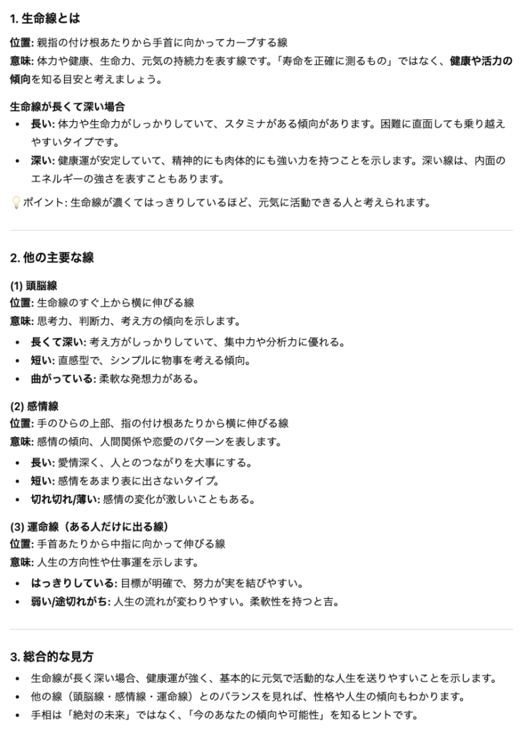 プロンプト:「手相について教えてください。生命線が長くて深い場合の意味を、ChatGPTが詳しく解説してください。他の主要な線についても説明してください。」