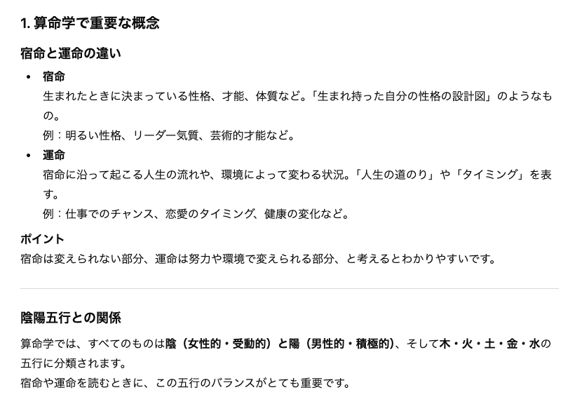 算命学の哲学的な側面から実践的な活用法まで、AIが幅広く解説。算命学を学ぶ第一歩として活用できるでしょう。