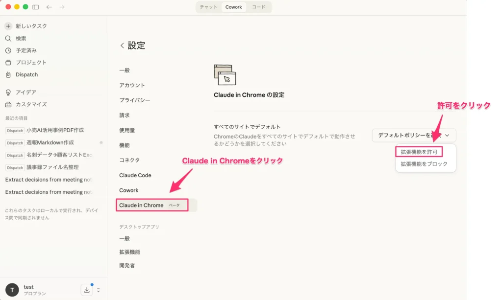 ※事前にCoworkの設定から「Claude in Chrome」を開き、「拡張機能を許可」にしておく必要があります。