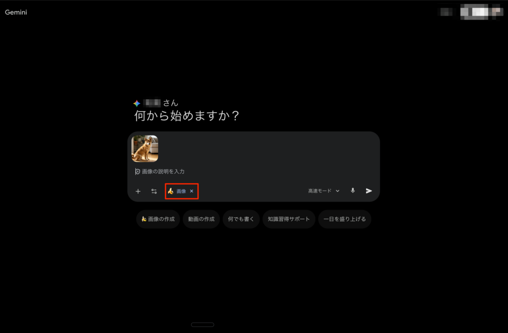 Geminiを起動したら、チャット画面下部のメニューから画像生成モードに切り替えましょう。