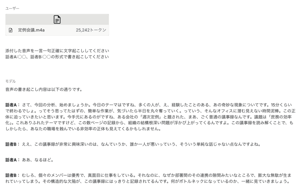 これを超えるような超長時間の録音データを一度に処理しようとすると、途中でモデルが応答を止めてしまったりエラーになる可能性が高まりますよ。