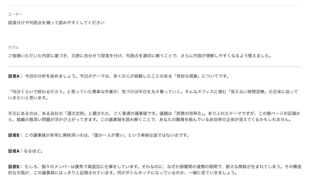 たとえば「一文ごとに改行してください」「箇条書きに整形してください」「発言者ごとに段落を分けてください」など、求めるフォーマットを先に伝える方法ですよ。