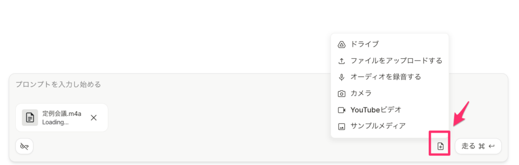 ファイルを読み込んだら、いよいよGeminiに文字起こしを依頼するプロンプトを入力します。