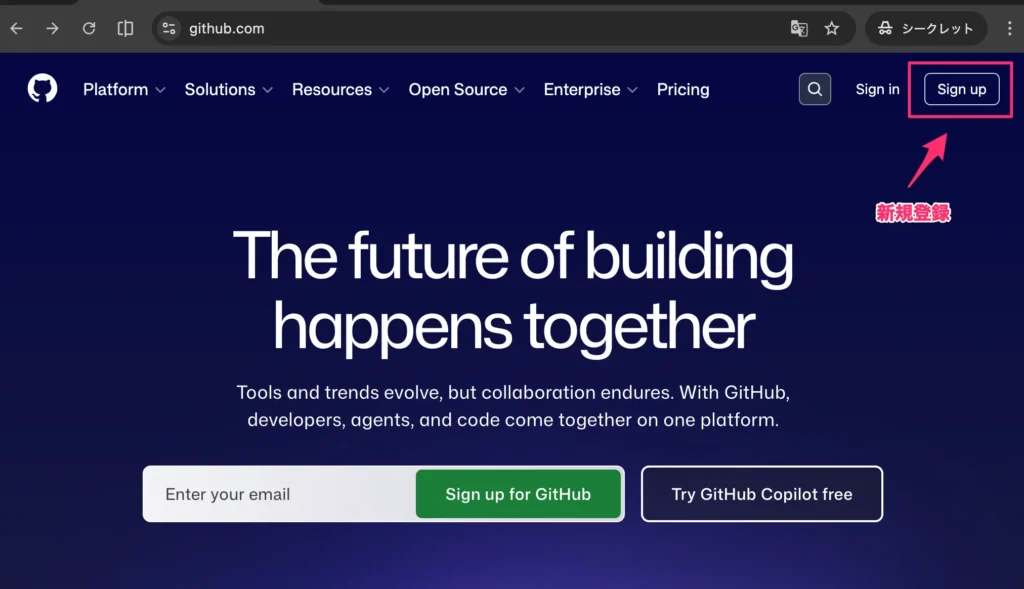 - github.comにアクセスし「Sign up」をクリック