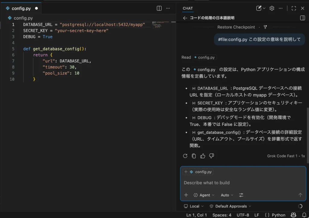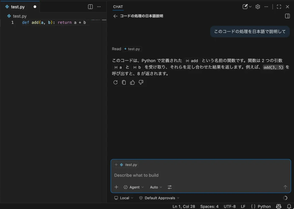 - チャットによるコード生成:「〇〇する関数を作って」と日本語で指示すると、コードを生成してくれます