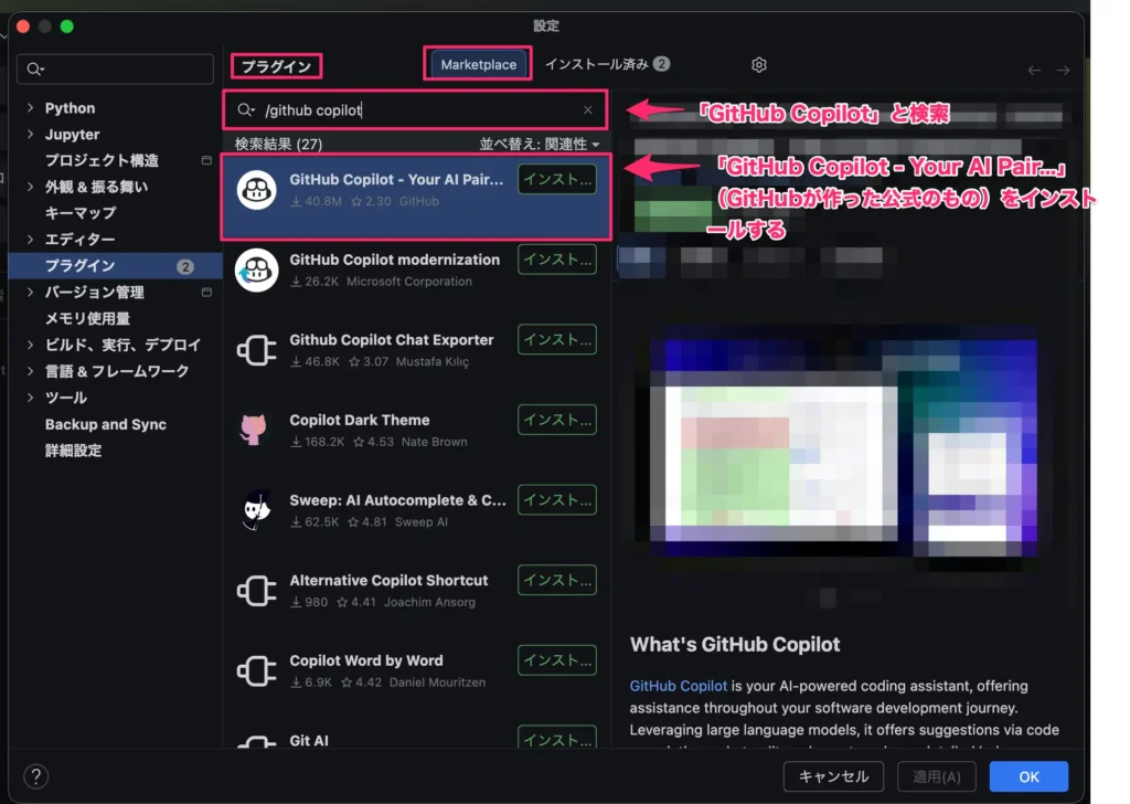 - 「Marketplace」タブで「GitHub Copilot」を検索してインストール