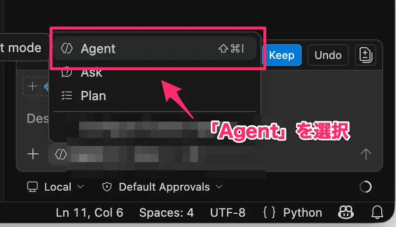 - 入力欄の下部にあるモードセレクターで「Agent」を選択