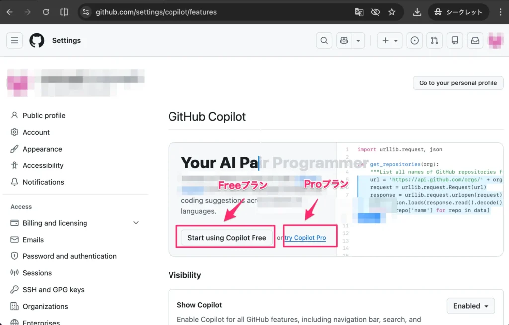 - Freeプランを有効化する場合は「Start using Copilot Free」を選択