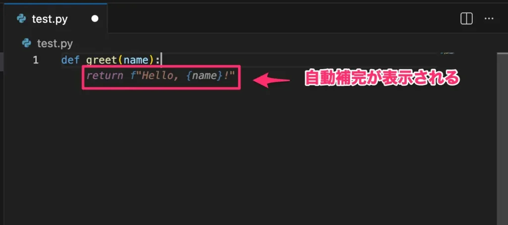 提案はグレーテキストでカーソルの後ろに表示され、Tabキーを押すだけで採用できます。気に入らなければEscキーで却下するだけなので、通常のコーディング作業を邪魔することなく使えるでしょう。