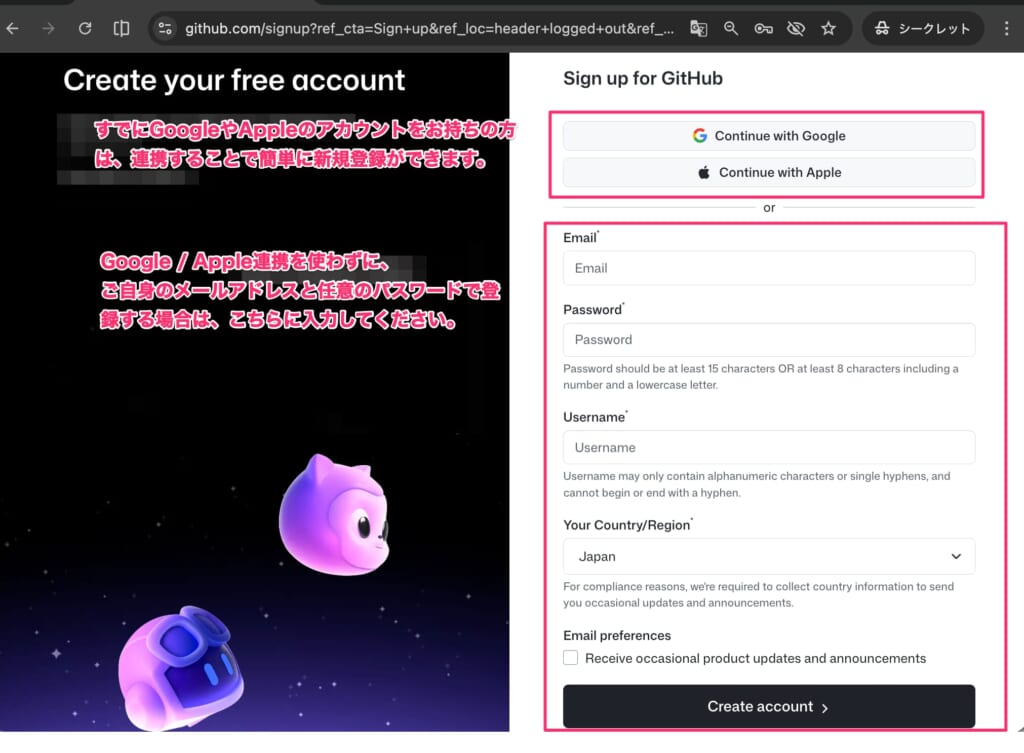 GitHubアカウントをまだ持っていない場合は、まずgithub.com/signupからアカウントを作成しましょう。
