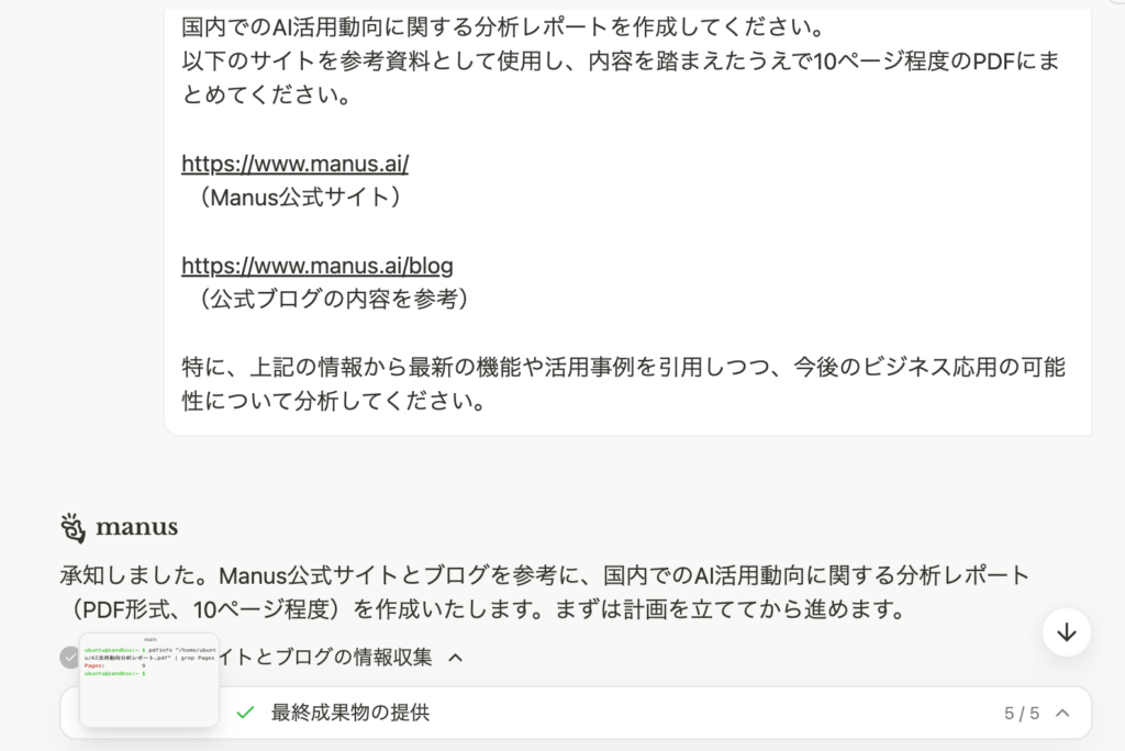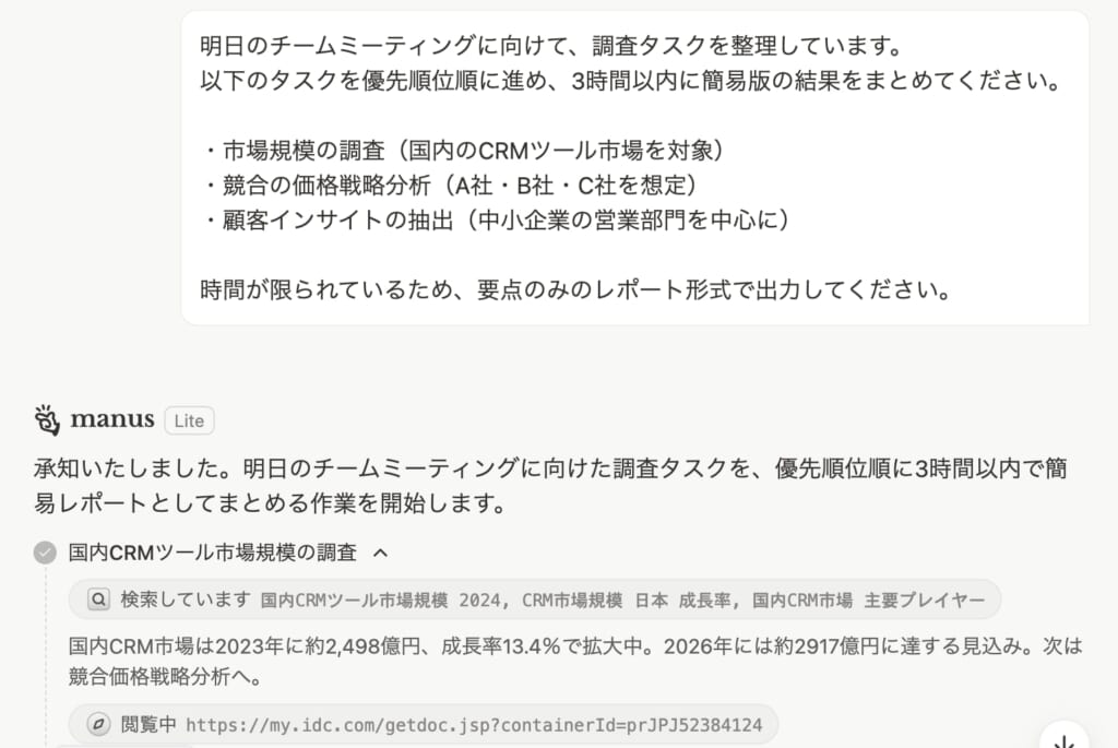 また、社内資料やGoogle Driveのリンクも共有可能(適切な権限設定が必要)。これにより、公開情報だけでなく、独自のデータを含んだ分析も実行できるため、よりカスタマイズされた成果物を得られるのがManusの大きな強みとなっています。