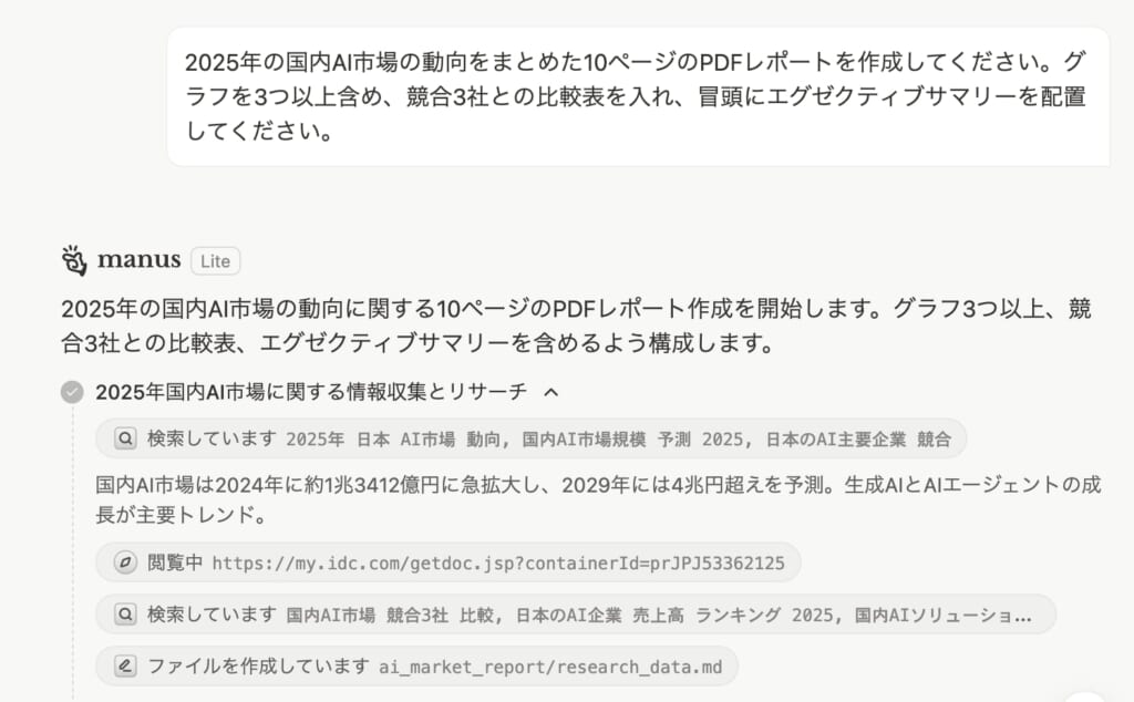 たとえば市場調査を行う場合、ChatGPTでは質問と回答を繰り返しながら情報を集める必要がありますが、Manus AIでは「〇〇市場の調査レポートを作成」と指示するだけで、データ収集から分析、レポート作成までを自動で進めます。ChatGPTがユーザーと対話しながら補助するスタイルであるのに対し、Manusは指示に基づいてタスク全体を実行するスタイルといえます。