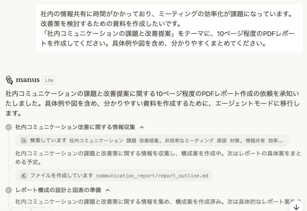さらに、Manusは作業の途中経過をもとに判断を行い、必要に応じて追加の情報収集や分析を実施します。こうした「考えながら実行する」動作設計は、AIエージェント型の進化を感じさせる機能の一つです。