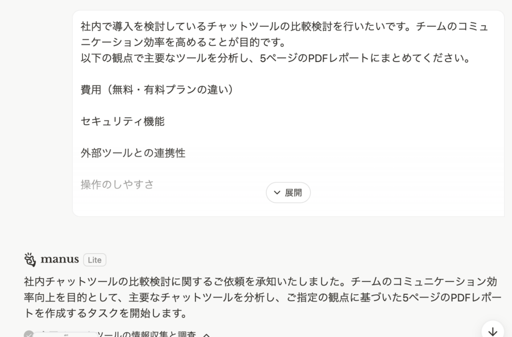 たとえば競合分析なら「・各社の売上規模 ・主力製品の特徴 ・価格帯の比較 ・マーケティング戦略 ・今後の成長性」といった形で指定。この方法により、Manus AIは構造化された分析を行い、比較しやすい形式でまとめてくれます。