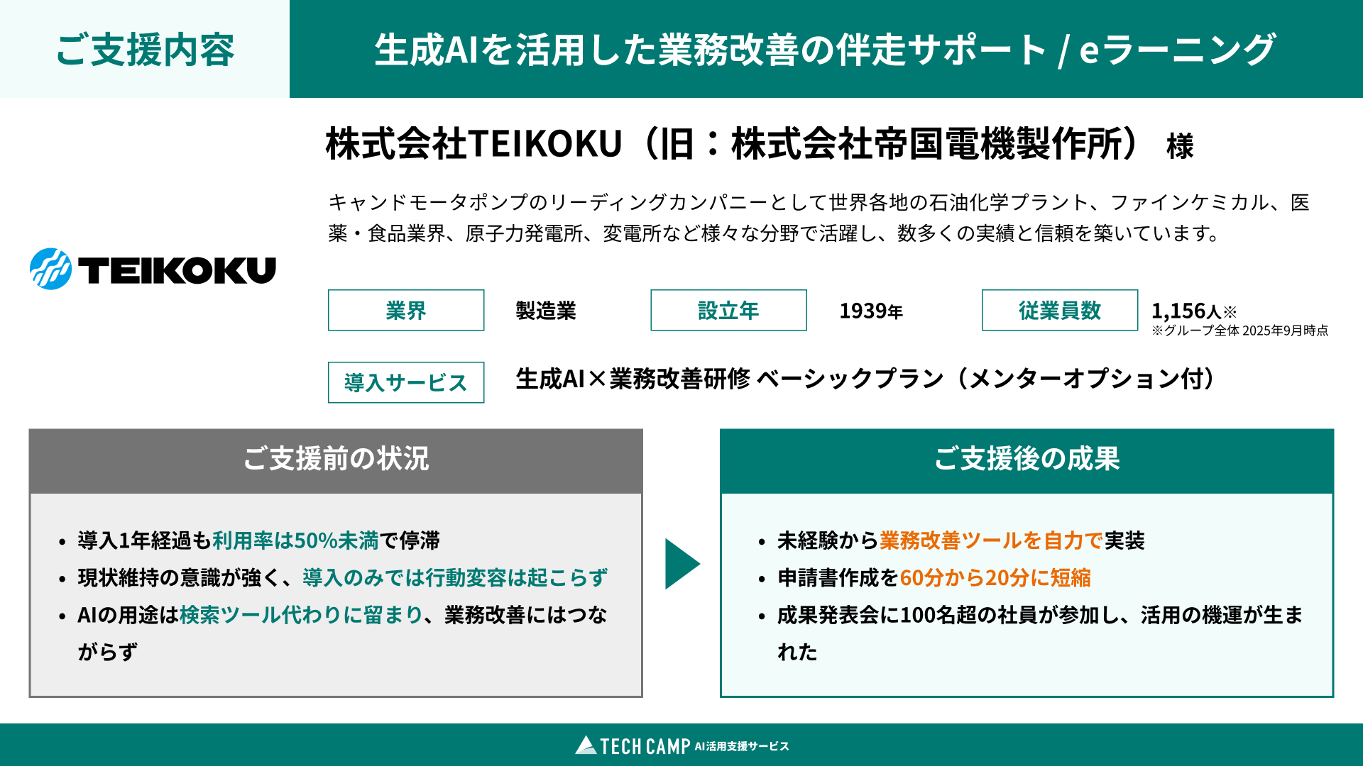 キャンドモータポンプで世界トップのシェアを誇る株式会社TEIKOKU(旧:株式会社帝国電機製作所)。同社の技術開発本部では2024年4月より生成AIを導入しましたが、1年が経過しても利用率は50%に届かず、本格的な活用には至っていませんでした。