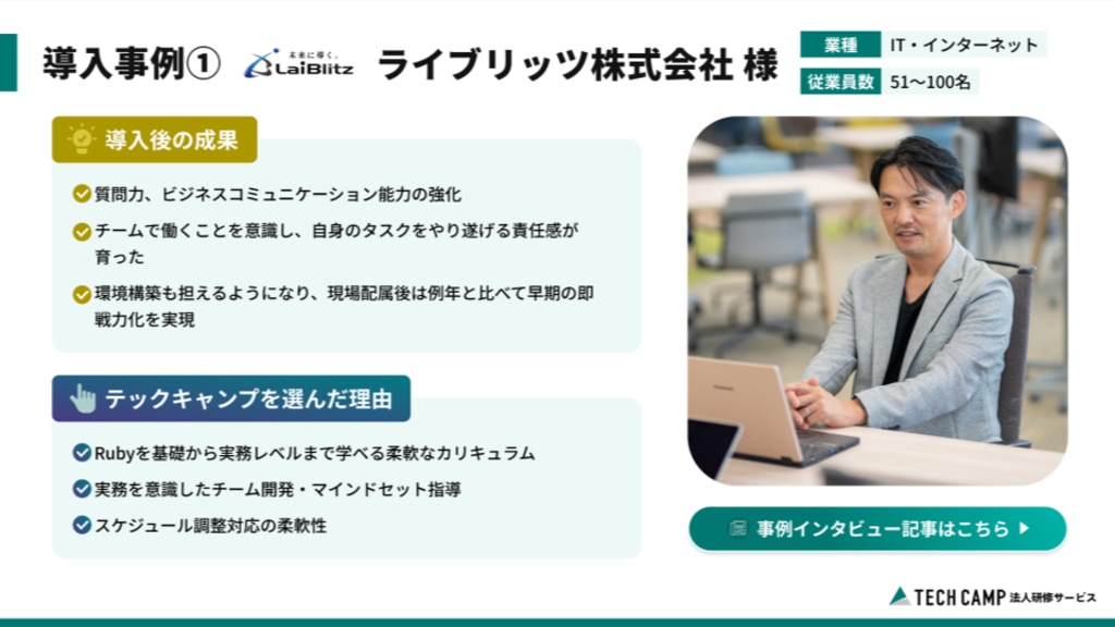 テックキャンプの新入社員エンジニア研修の導入事例集です。